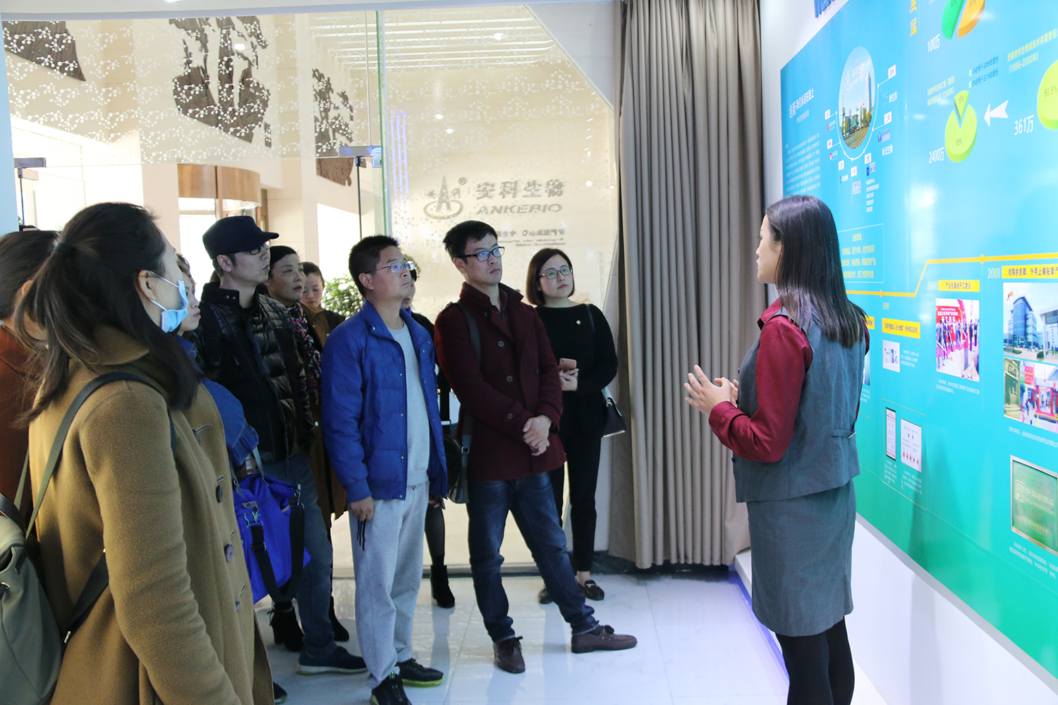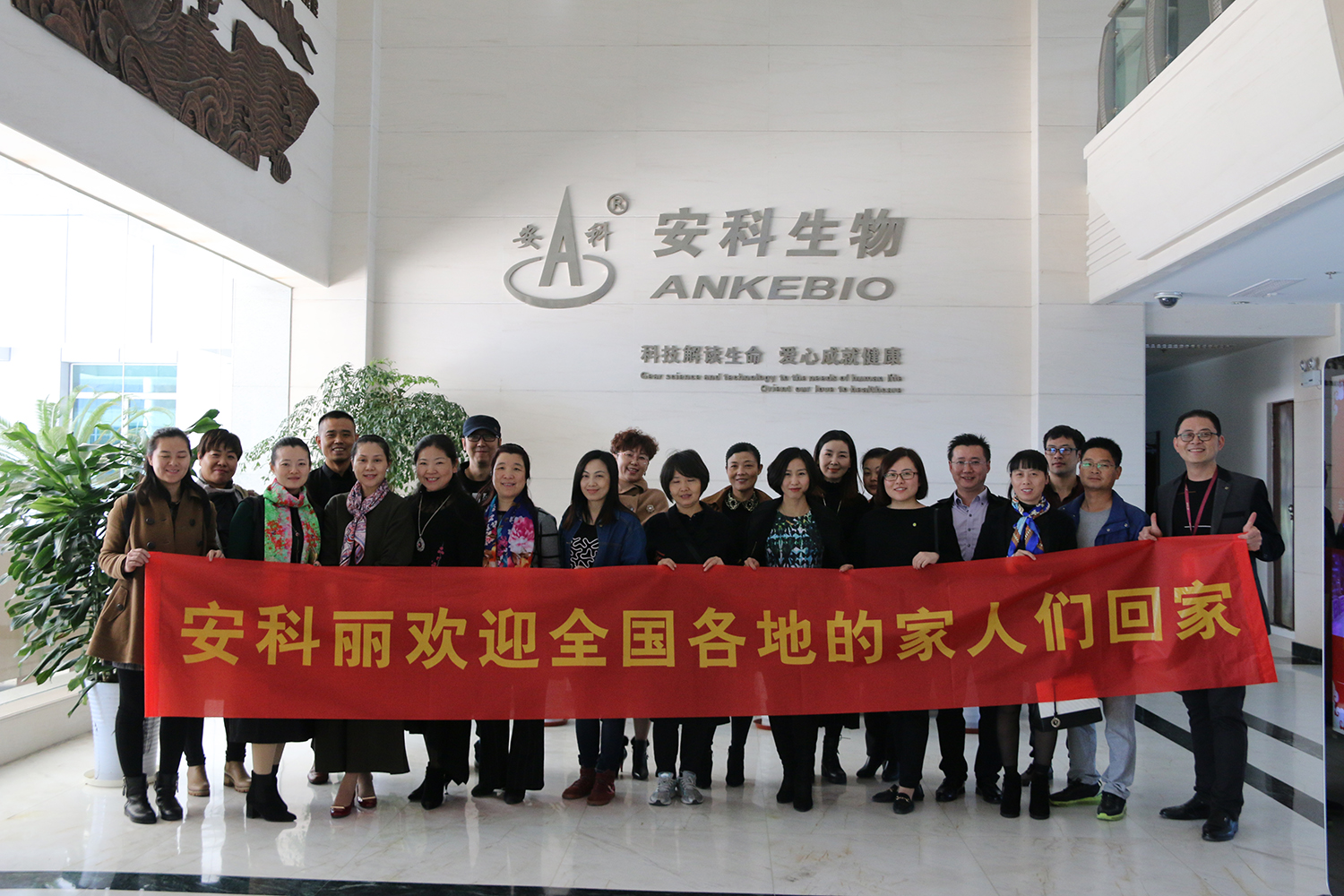 當天上午10點半,所有的家人們在安科生物總部集合,由創業導師千荀及米麗帶領,先后參觀了總部品牌展廳、二樓休息大廳、公司休閑書吧及健身房等區域,最后,在安科麗所屬“鑫華坤生物”會議廳展開產品交流及工作內容的進一步溝通。